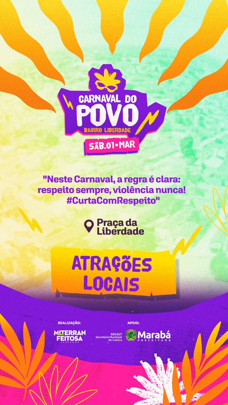 Na noite deste sábado (1º), acontece o 1º Carnaval do Povo no Bairro Liberdade, em Marabá, no sudeste do Pará. O evento conta com atrações locais, atividades de saúde promovidas pela Secretaria Municipal de Saúde e outras ações voltadas ao público. Com o tema “Neste carnaval, a regra é clara: respeito sempre, violência nunca! #CurtaComRespeito”, a festa busca promover um ambiente seguro e acessível para a população.